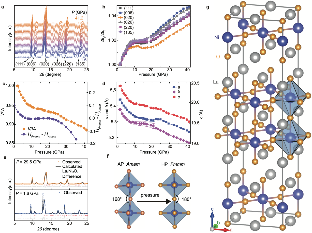 圖2. La3Ni2O7高壓下的同步輻射測量及結(jié)構(gòu)分析。