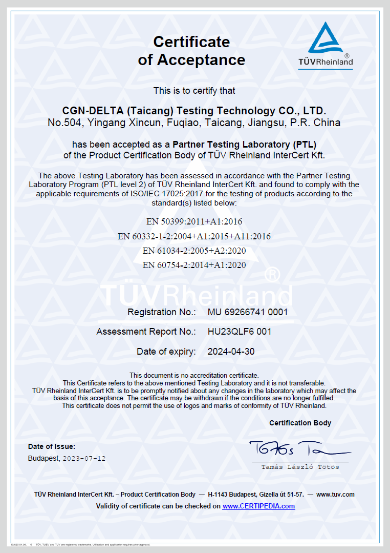中廣核(太倉)檢測公司作為CMA與CNAS認可的實驗室,一直以來秉持“科學、公正、準確、高效”的質量方針,幫助企業提升產品的市場價值。TÜV萊茵在全球擁有完善的服務網絡、良好的品牌影響力和專業的服務團隊。此次合作,標志著公司測試能力符合國際主流標準的要求,并在設備、環境、管理體系等方面均與國際接軌。