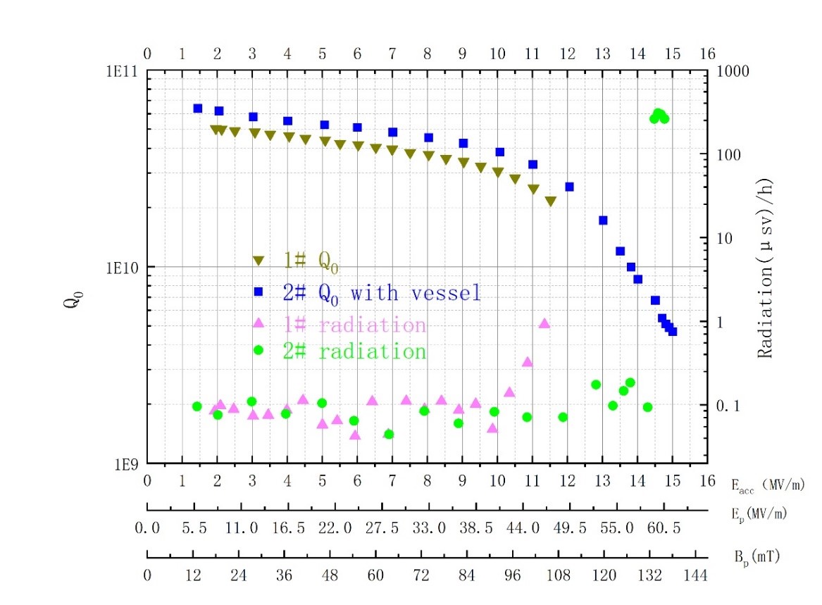 經過2K垂直測試,1#腔最大梯度達到11.6MV/m,對應 Q0=2.18E10。2#腔在1#腔基礎上對焊接工藝進行優化,其帶氦槽測試最大梯度達到15 MV/m,峰值磁場達到138mT,峰值電場達到61.5MV/m,在設計運行梯度7.3MV/m時,Q0=4.6E10,在14MV/m以下無明顯劑量。