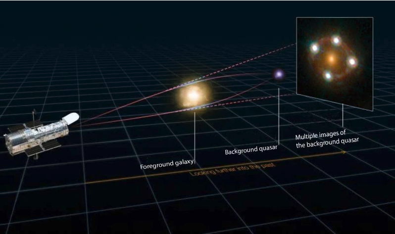 圖2. 遙遠類星體發出的光,在經過前方星系的引力勢阱的時候發生了彎曲,所以光在到達望遠鏡的時候所看到的圖片會像最右邊圖像所顯示的那樣。(圖源:Martin Millon/Swiss Federal Institute of Technology Lausanne;Hubble Space Telescope/NASA)
