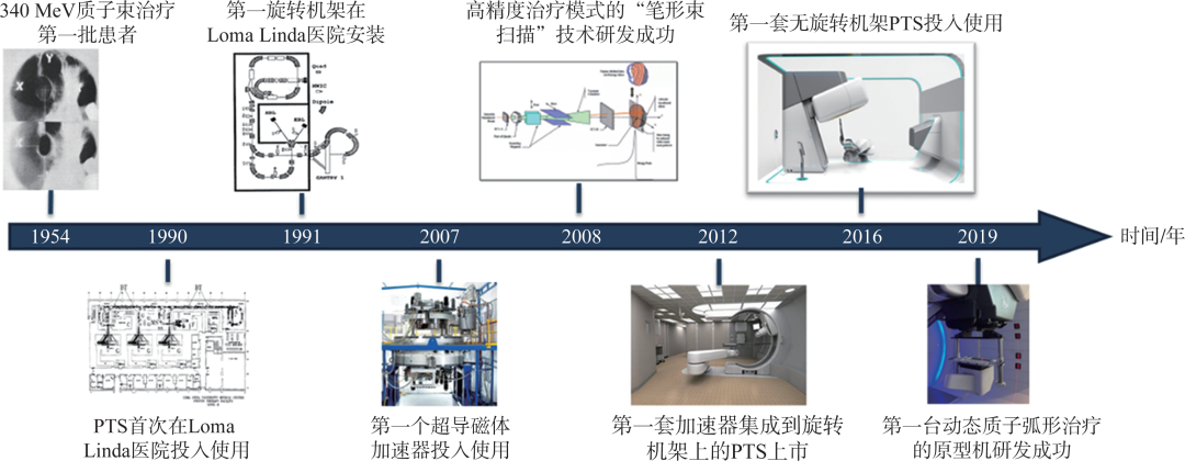 文章首先描述了質子治療取得的巨大進步,并根據質子治療關鍵技術首次的發布時間節點介紹了質子治療技術的發展概況,其主要技術成果如下圖1所示。