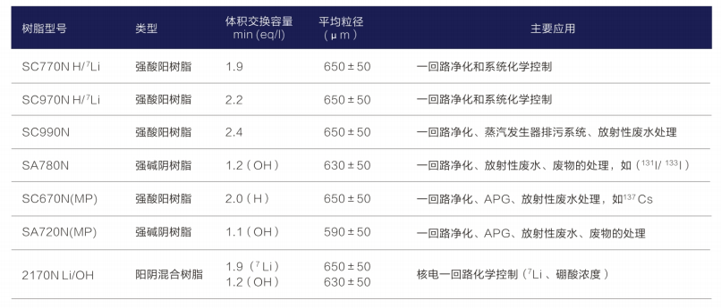 藍曉科技自主開發的系列核級均粒樹脂結構穩定、機械強度高、抗氧化性能強、雜質離子含量低,可有效控制核電廠一,二回路水質,達到核級應用要求。該系列可應用干蒸汽發生器排污系統(APG)、化學與容積控制系統(RCV)、反應堆和乏燃料水池冷卻和處理系統(PTR)、硼回收系統(TEP)、放射性廢液處理系統(TEU)等,具體產品介紹如下: