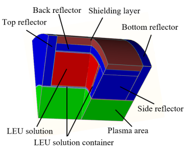 他們引入的亞臨界包層系統(SBS)組件由低濃縮鈾(LEU)溶液提供燃料,并由壓縮氘-氘(D-D) 氣動磁鏡聚變中子源(GDT-FNS)提供動力。
