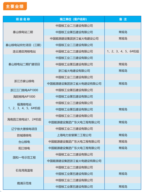 憑借過硬的產品和技術,以及上乘的服務,公司先后與中核集團、中國能建集團、東方電氣集團、哈爾濱電氣集團、中國電建集團和上海電力等央企達成了合作,產品先后用于秦山核電站二期、秦山核電站坎杜項目(三期)、連云港田灣核電站、福清核電、遼寧徐大堡核電項目、三門核電、漳州核電、海南昌江核電、防城港核電、臺山核電、陽江核電、國和一號示范工程、石島灣高溫氣冷堆、霞浦示范快堆、迪拜哈斯彥清潔燃煤電廠、伊拉克巴格達電廠、伊朗SAHAND電廠、印度文達特火電廠等多個電廠項目。