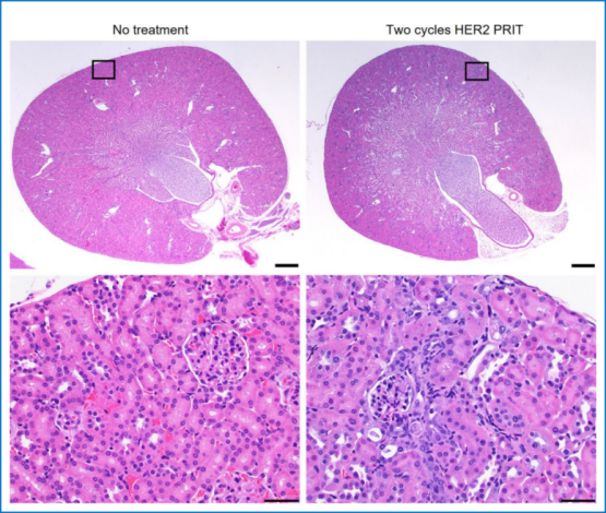 圖5。接受1個 (37 kBq)或2個 (74 kBq)周期的HER2 225Ac-PRIT治療的小鼠中觀察到最小到輕度的放射性腎病。如圖所示,在腫瘤接種后154天(治療開始于第15天),未經治療的對照組和接受2個周期的HER2 225Ac-PRITT治療的小鼠腎臟的代表性蘇木精和伊紅染色。頂部圖像的比例尺:500μm。底部圖像的比例尺:50μm。
