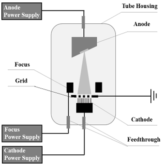 目前被廣泛采用的X射線源技術(shù),依靠“陰極加熱發(fā)出電子,電子打到陽極靶盤,發(fā)射X射線”,整個過程X射線源始終處于高壓、高熱、高轉(zhuǎn)速的狀態(tài),且需要保證高效的散熱、較高的穩(wěn)定性和較長的工作壽命,近年來一直都難有跨越式的發(fā)展。以安檢行業(yè)CT查驗設(shè)備為例,受CT滑環(huán)轉(zhuǎn)速、旋轉(zhuǎn)精度以及環(huán)上器件在高轉(zhuǎn)速下的可靠性等的限制,安檢CT的成像質(zhì)量和掃描效率幾乎達到極限,設(shè)計新型X射線源、研究相應的掃描成像方法,從根本上改變CT依賴滑環(huán)旋轉(zhuǎn)這一成像方式,已成為當前理論研究與應用技術(shù)發(fā)展的重要難題與挑戰(zhàn)。采用分布式X射線源實現(xiàn)靜態(tài)CT超快速成像是近年來輻射成像理論和應用發(fā)展的新熱點,為上述難題的解決帶來新的希望。19世紀末,科學家陸續(xù)發(fā)現(xiàn)電子在常溫下還可以從陰極表面通過量子隧穿效應逃逸,稱其為“冷陰極”發(fā)射。1991年,伊吉瑪教授發(fā)現(xiàn)碳納米管這一全新的碳基材料結(jié)構(gòu),其超大的長徑比、極高的電導率、較強的機械強度和化學穩(wěn)定性等特點,被認為是理想的“冷陰極”材料。2002年,美國北卡羅萊納大學的Otto Zhou團隊首次實現(xiàn)碳納米管“冷陰極”X射線源10mA級別的出束流強,達到工業(yè)、安檢成像所需水平,由此打開“冷陰極”X射線源規(guī)模化商用的大門。2007年,清華大學輻射成像團隊基于分布式X射線源開展了CT三維成像應用的早期研究,對分布式射線源靜態(tài)CT系統(tǒng)、快速靜態(tài)CT成像方法等方面開展了大量研究工作。國內(nèi)外高校團隊的早期探索,給了創(chuàng)新技術(shù)的發(fā)展和成熟提供了最好的土壤。