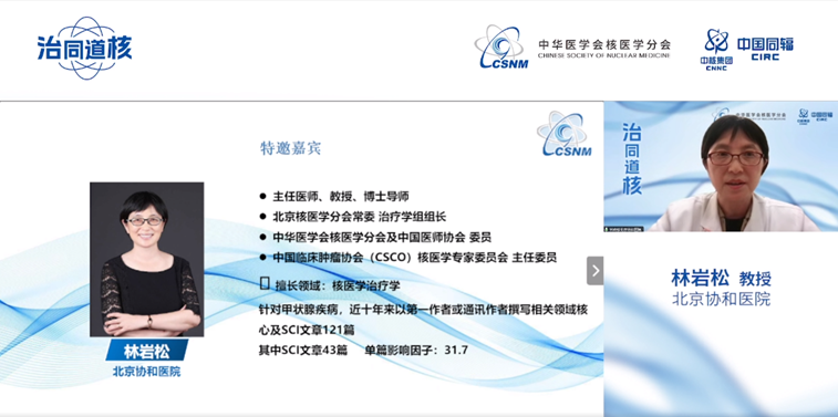 中華醫(yī)學(xué)會核醫(yī)學(xué)分會委員、第十二屆中華醫(yī)學(xué)會核醫(yī)學(xué)分會治療學(xué)組專家指導(dǎo)委員會主任、北京協(xié)和醫(yī)院林巖松教授作為特邀嘉賓對參與分享的兩位講者分享的內(nèi)容給予了肯定,林教授強調(diào),"治"同道"核"是一個人才梯隊的培養(yǎng)平臺,從中看到我們年輕學(xué)者不斷成長,后生可畏。本期活動展示的病例中可以看到,甲狀腺癌其實并不完全是所謂的“懶癌“,有時也會非常兇險,碘難治性甲狀腺癌侵襲性強進展快,死亡風(fēng)險高。從付浩博士展示的病例中可以看到, 針對碘難治性甲狀腺癌診治,在經(jīng)典的以NIS靶向的碘-131診治之外,核醫(yī)學(xué)還有其它的治療靶點,如以FAP為靶向的診療一體化。本次活動分享的內(nèi)容,啟發(fā)了思路,給碘難治性甲狀腺癌帶來了新的曙光。核醫(yī)學(xué)作為診療一體化的平臺,會被越來越多相關(guān)的臨床科室和病人重視。未來“治”同道“核”—云上分享會也應(yīng)邀請更多相關(guān)學(xué)科的專家進行點評,以開闊核醫(yī)學(xué)同仁視野,發(fā)現(xiàn)核醫(yī)學(xué)更多的應(yīng)用場景,共同為中國治療核醫(yī)學(xué)的繁榮明天添磚加瓦!