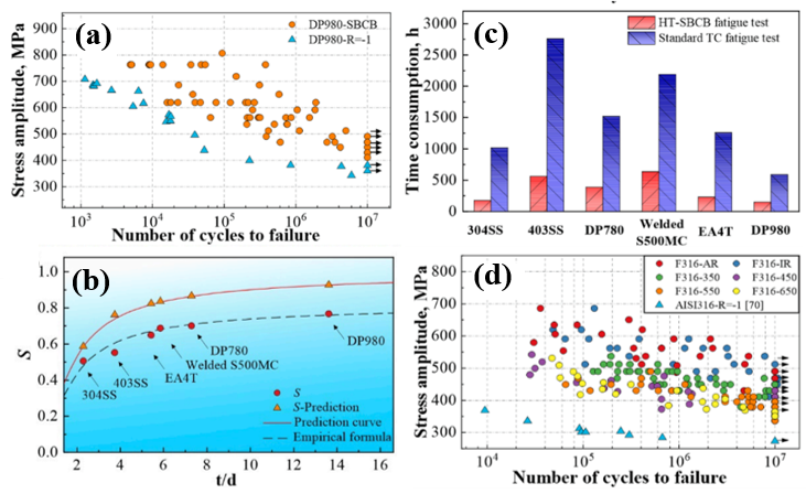 ▲圖3 (a)典型工程材料高通量方法與標準方法測試的疲勞性能對比;(b)轉換因子與材料尺度的函數關系;(c)采用高通量與標準方法進行疲勞極限測試所需時間對比;(d) 核電用F316鋼經輻照和熱暴露服役后高通量疲勞性能測試與驗證。