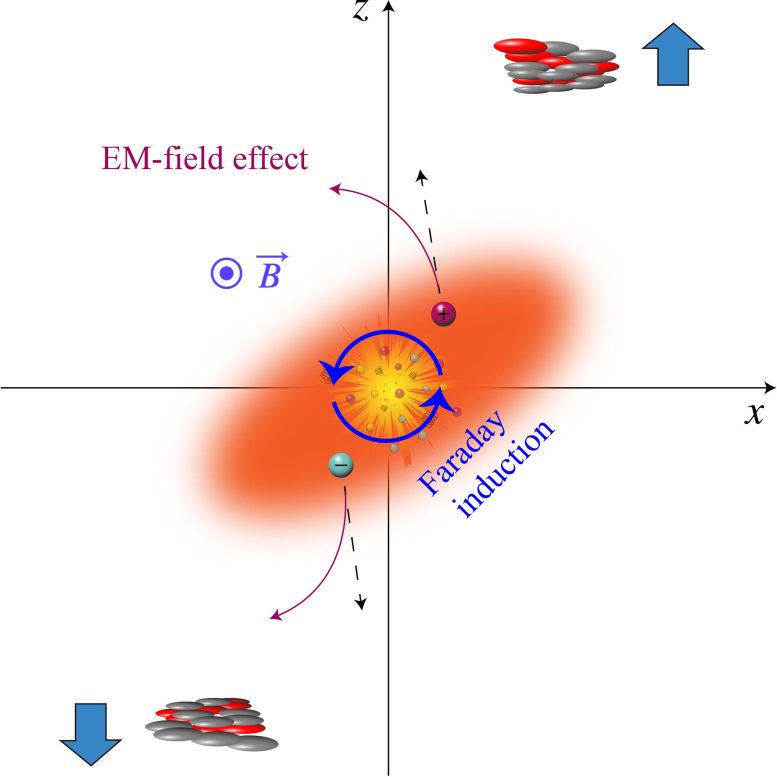 偏心重離子碰撞的自上而下視圖。超強(qiáng)磁場(chǎng) (B) 的快速衰減會(huì)通過法拉第感應(yīng)產(chǎn)生電流,影響帶電粒子的軌跡。偏轉(zhuǎn)程度與夸克-膠子等離子體(QGP)的電導(dǎo)率直接相關(guān),這為科學(xué)家提供了一種測(cè)量這一重要特性的方法。圖片來源:Diyu Shen/復(fù)旦大學(xué)