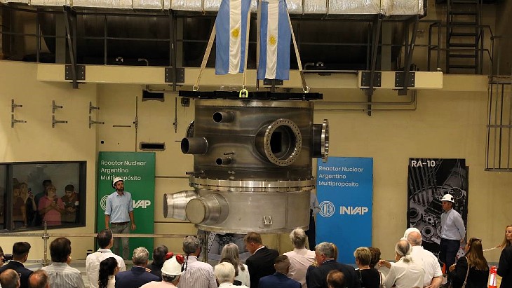 它被起重機(jī)吊到 RA-10 反應(yīng)堆池的高度,準(zhǔn)備安裝,財(cái)政部長(zhǎng)卡洛斯·古伯曼、阿根廷國(guó)家原子能委員會(huì) (CNEA)主席阿德里安娜·瑟奎斯和工作人員等參觀者見證了這一時(shí)刻 負(fù)責(zé)該項(xiàng)目的人員以及參與該反應(yīng)堆建設(shè)的國(guó)內(nèi)各公司的代表。