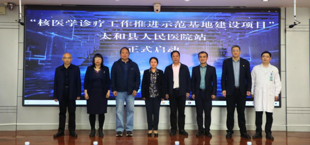 中華醫學會核醫學分會汪靜主委、太和縣衛生健康委李震主任、安徽省核醫學質控中心王雪梅主任、安徽省醫學會核醫學袁超主委、安徽省核醫學醫師協會汪世存會長、太和縣人民醫院祝振華書記、太和縣人民醫院趙曙光院長、中華醫學會核醫學分會青年學組康飛副組長共同上臺啟動項目。