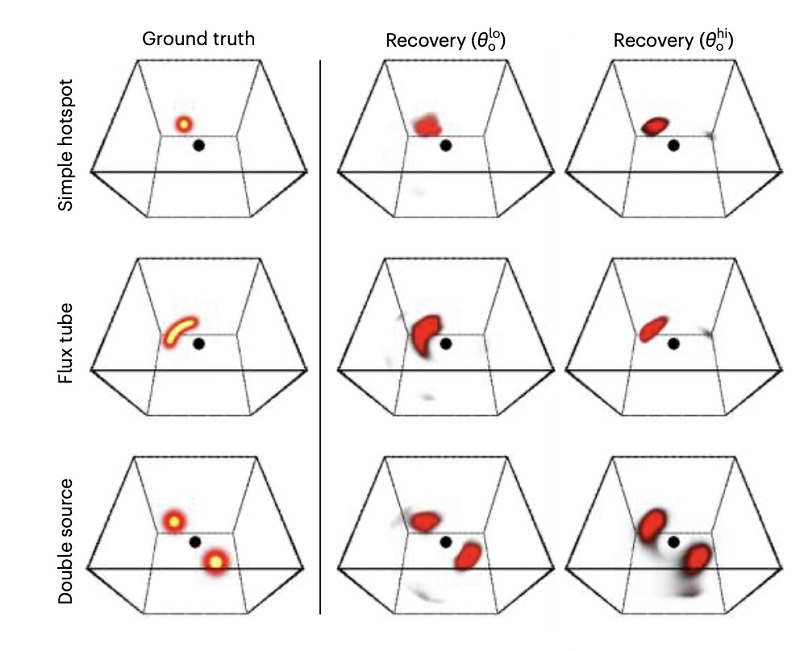 基于這一新技術(shù),團(tuán)隊(duì)再利用阿塔卡馬大型毫米波/亞毫米波陣列(ALMA)在2017年4月11日的觀測(cè)結(jié)果,研究了無線電波長的耀斑的3D外觀。用這個(gè)數(shù)據(jù)集重建3D圖像,會(huì)因?yàn)榫嚯x和亮度變化顆粒細(xì)節(jié)而存在困難,因而研究團(tuán)隊(duì)用一種基于神經(jīng)網(wǎng)絡(luò)的新計(jì)算機(jī)技術(shù),并科用黑洞的預(yù)測(cè)物理性質(zhì)和電磁輻射過程對(duì)該神經(jīng)網(wǎng)絡(luò)進(jìn)行約束。