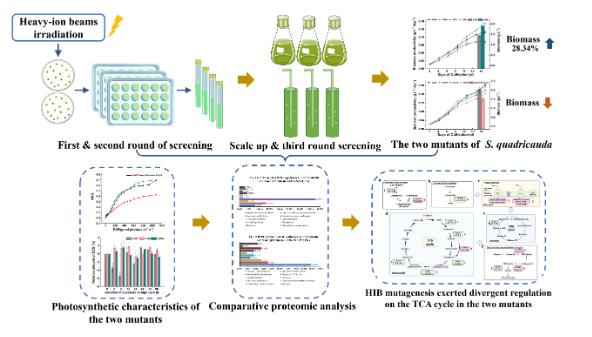 科研人員利用蘭州重離子研究裝置(HIRFL)提供的碳離子束,對環境適應性強的四尾柵藻進行了誘變選育,獲得了兩株光合特性、固碳能力與野生型對比鮮明的突變株;其中高固碳能力突變株生物量積累高于野生型的28.34 %,并且表現出對長時間高光脅迫的適應性。通過對兩株突變株光合特征與比較蛋白組學的關聯分析,科研人員發現重離子束輻射誘導的中心碳代謝差異蛋白對突變株固碳能力強弱起到重要調控作用;另外,與突變株固碳能力關聯的三羧酸循環差異調控,為高效固碳微藻工程株選育提供了潛在靶點。