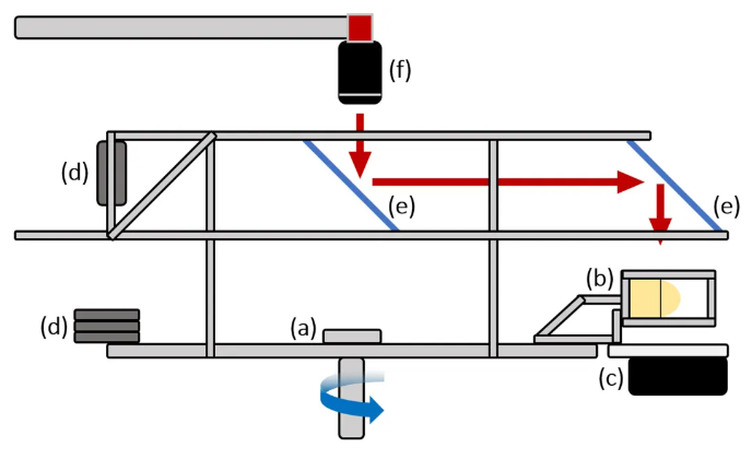 旋轉(zhuǎn)輪實驗設(shè)施的示意圖,其中 (a) 旋轉(zhuǎn)盤,(b) 測試區(qū),(c) LED光源,(d) 配重,(e) 鏡子,和 (f) 高速攝像機。圖片來源:Lehigh University湍流混合實驗室 蛋黃醬繼續(xù)幫助研究人員更好地理解核聚變背后的物理原理