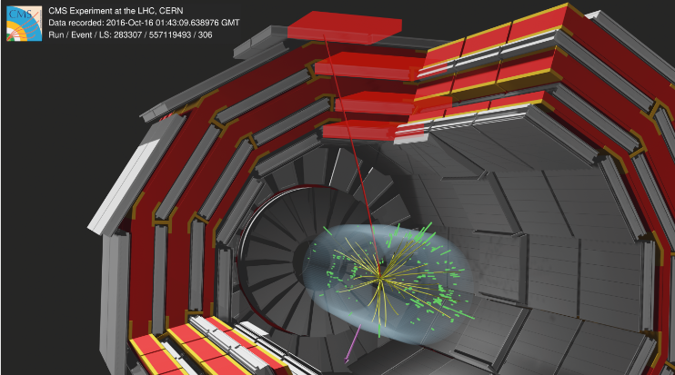 對(duì)于一個(gè)W玻色子衰變成介子(紅線)和一個(gè)逃避檢測(cè)的中微子(粉色箭頭),CMMS候選碰撞事件。(圖片:中央研究中心/歐洲核研究所)