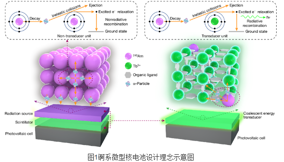 本文提出了一種微核電池架構,該架構通過將243Am嵌入發光鑭系配位聚合物中,納入了一個匯聚能量轉換器。此舉在分子層面將放射性同位素與匯聚能量轉換器相結合,與傳統架構相比,實現了從α衰變能量到持續自發光的能量轉換效率高達8000倍的提升。當該架構與將自發光轉換為電能的光伏電池結合使用時,便獲得了一種新型輻射光伏微核電池,其總功率轉換效率為0.889%,每居里功率達到139微瓦(μWCi-1)。
