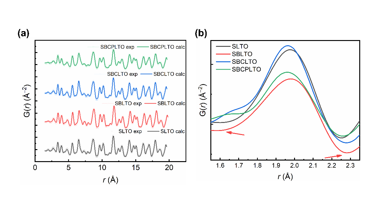 圖1. 變熵酸鍶基熱電材料的全散射實驗數據及逆蒙特卡洛擬合結果,(a)總對分布函數; (b) Ti-O 部分對分布函數