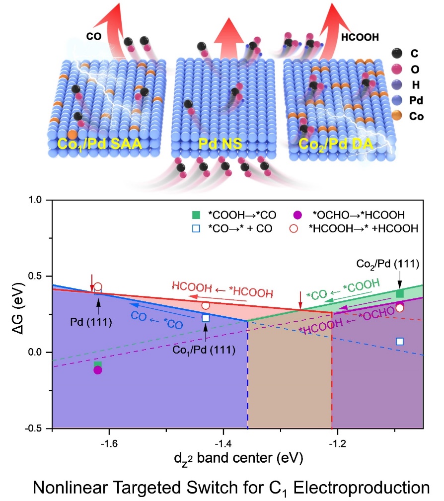 構建用于CO2電轉換的靶向開關,對于定向獲取高值化學品以實現“雙碳”戰略至關重要,但是目前活性位點的對稱性及拓撲結構與催化性能之間缺乏普適關聯性,嚴重阻礙了對多種中間體競爭性路徑的精準調控。本工作中,團隊基于前期對局域對稱性破缺單原子催化劑用于高效CO2電還原產甲酸(Nat. Commun. 2023, 14, 6849;ESI高被引論文)的研究,采用原子植入策略,在金屬鈀烯上成功構建了用于C1產物選擇性切換所需的非線性靶向開關Cox/Pd(x=1, 2)。從Co1/Pd切換到Co2/Pd,可使C1產物(CO和甲酸)選擇性發生非線性、高對比度翻轉(選擇性均超過94%),而且在工況電流密度(-150 mA cm-2)下連續工作200小時仍能保持優異的選擇性和電流效率。原位譜學和理論計算發現特定的近鄰金屬位點組合能夠調節dz2能帶中心,誘發中間體優先吸附構型的非線性切換,進而控制C1產物的轉化路徑。該研究揭示了一種用于C1產物高選擇性轉換的理想開關,為通過特定拓撲結構組裝來精細調控能量轉換過程提供了新視角。高能所博士后裴加景、張貴凱和中國計量大學李燦為論文共同第一作者,高能所為唯一通訊單位,董俊才特聘青年研究員為論文通訊作者。