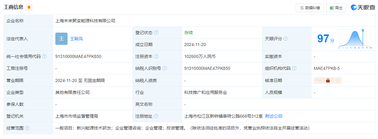 11月20日,上海未來聚變能源科技有限公司正式成立,注冊資本10.26億元。公司經營范圍包括:新興能源技術研發、企業管理咨詢、企業管理、投資管理。