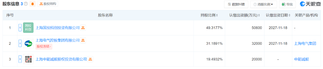 天眼查顯示,公司股東包括上海國投科創投資有限公司、上海電氣控股集團有限公司、上海申能誠毅股權投資有限公司,持股比例分別為49.3177%、31.1891%、19.4932%。這三家公司均由上海市國資委直接或間接100%控股。