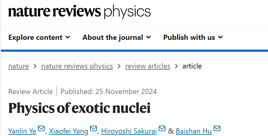 近日,應《自然綜述·物理》(Nature Reviews Physics)雜志邀請,北京大學物理學院、核物理與核技術國家重點實驗室葉沿林教授和楊曉菲教授聯(lián)合日本理化學研究所仁科加速器科學研究中心Hiroyoshi Sakurai教授和美國橡樹嶺國家實驗室胡柏山博士后研究員,共同發(fā)表了題為“奇特原子核物理”(Physics of exotic nuclei)的綜述文章。
