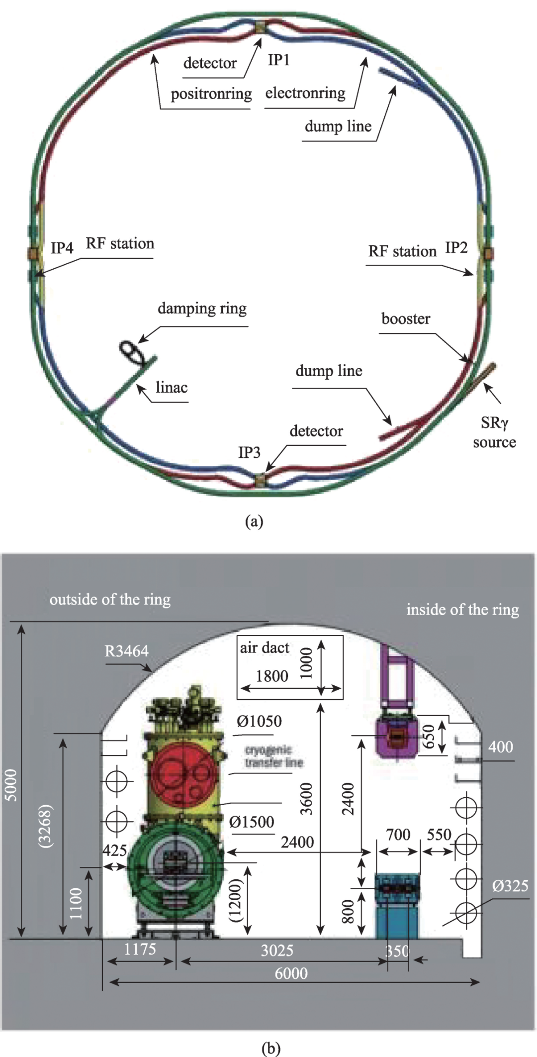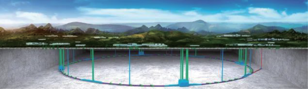 圖2 進(jìn)入地下:CEPC 布局(a) 和采用鉆爆法的隧道橫截面(b) ,顯示外側(cè)為SppC 環(huán)和低溫模塊( 綠色和紅色) ,內(nèi)側(cè)為CEPC 增強(qiáng)器( 紫色) 和對撞機(jī)環(huán)( 藍(lán)色)