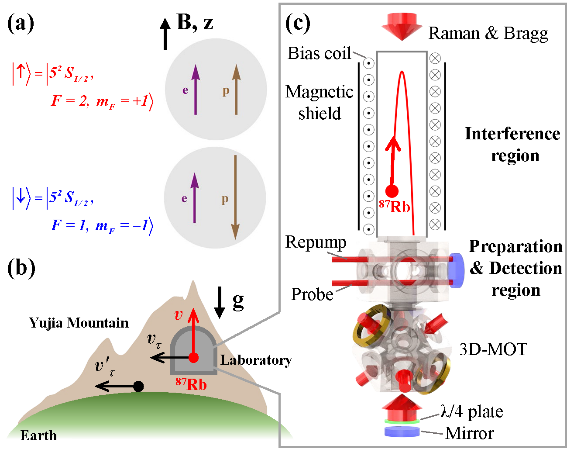 本工作提出了高精度布拉格原子干涉儀探測自旋-速度相關相互作用的新方案。團隊采用激光冷卻后的87Rb原子作為物質波源,構建高精度布拉格原子干涉儀,研制出對自旋-速度相關的相互作用敏感的傳感器。本工作巧妙的利用喻家山與地球作為非極化源,進一步將該類型新相互作用的檢驗尺度推進到5-100 m的區間,并且該方案不依賴于電子和質子不能同時具有該類相互作用的假設。