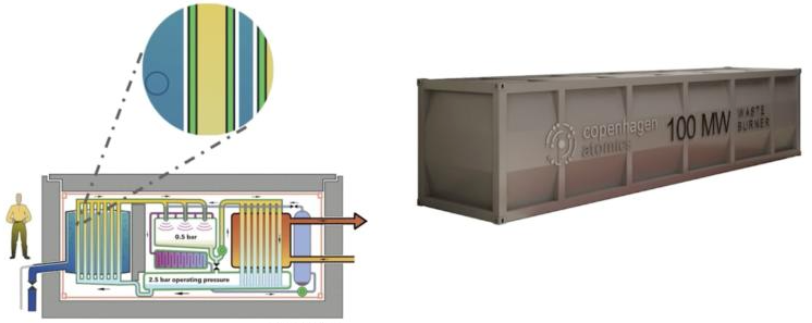 與此同時,Copenhagen Atomics正在開發(fā)一種非能動安全釷基熔鹽堆,名為廢料燃燒器(Waste-Burner),利用乏燃料和釷的組合發(fā)電。這個100 MWt的裂變設計為工廠化制造,可裝入一個40英尺的標準集裝箱,通過卡車、火車或輪船運輸。廢物燃燒器反應堆消耗包括钚在內的超鈾元素作為“啟動”燃料,將其轉化為只需儲存300年的短壽命裂變產物。