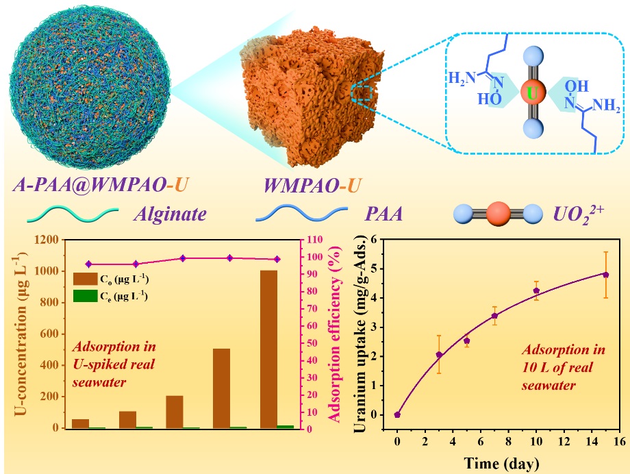 近日,中國科學院大連化學物理研究所儀器分析化學研究室生態環境評價與分析研究組(103組)陳吉平研究員團隊在海水提鈾研究方面取得新進展。團隊利用精心設計的蠟鑄造法和“相轉換”過程,制備了具有大孔結構的聚偕胺肟(WMPAO)水凝膠粒子,并將其包覆進海藻酸-聚丙烯酸(A-PAA)球中,制備了A-PAA@WMPAO復合球材料,該復合球材料可用于海水中鈾酰離子的富集分離。
