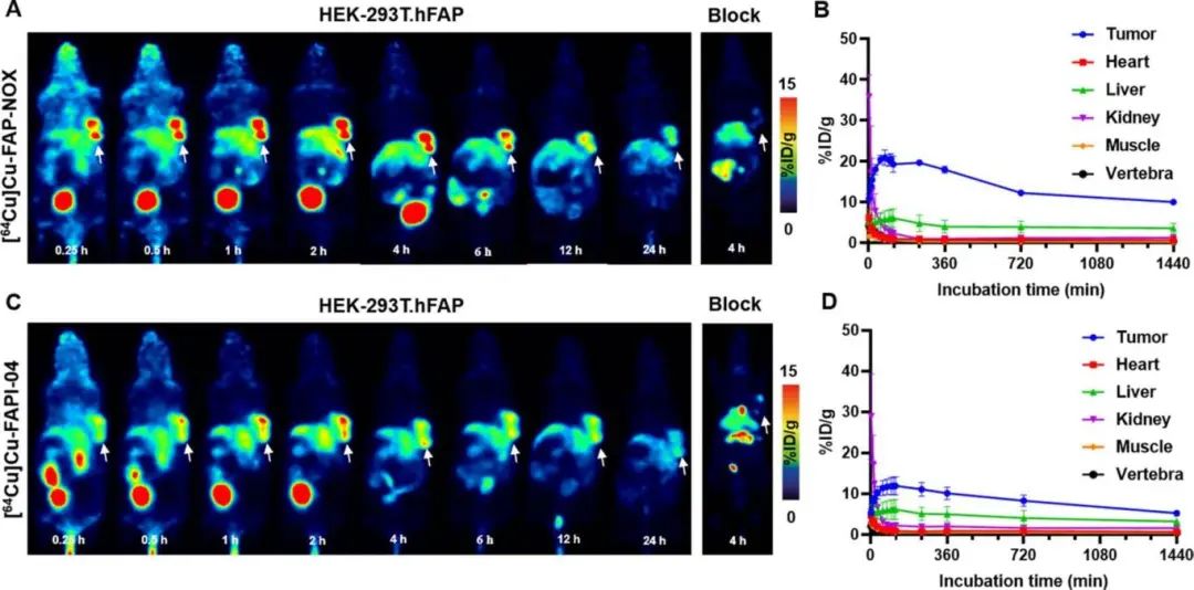 圖:[64Cu]Cu-FAP-NOX與[64Cu]Cu-FAPI-04在HEK-293T.hFAP細胞移植小鼠中的PET成像對比及組織分布情況