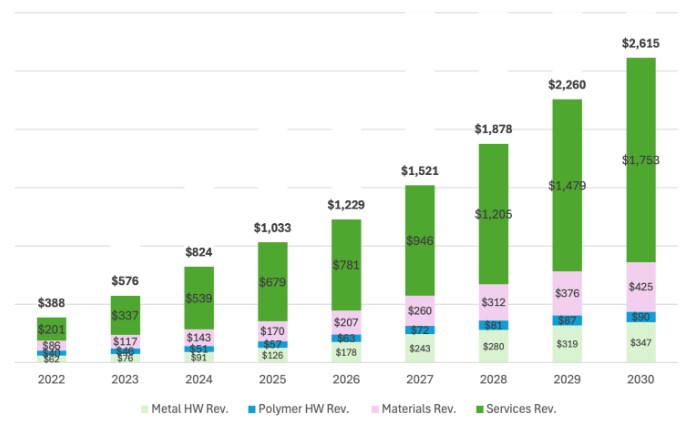 2024年12月6日,增材制造研究公司 (AM Research) 發布了最新的市場研究報告《2024 年軍事和國防增材制造》,報告顯示國防領域采用 3D 打印技術的占比大幅增長。這份更新的報告與 2023 年的報告相比有顯著修訂,預測國防部 (DoD) 的支出將從 2023 年的 3 億美元增加到2024 年的 8 億美元。研究報告預測國防市場將繼續擴張,預計到 2030 年市場規模將超過 26 億美元 。
