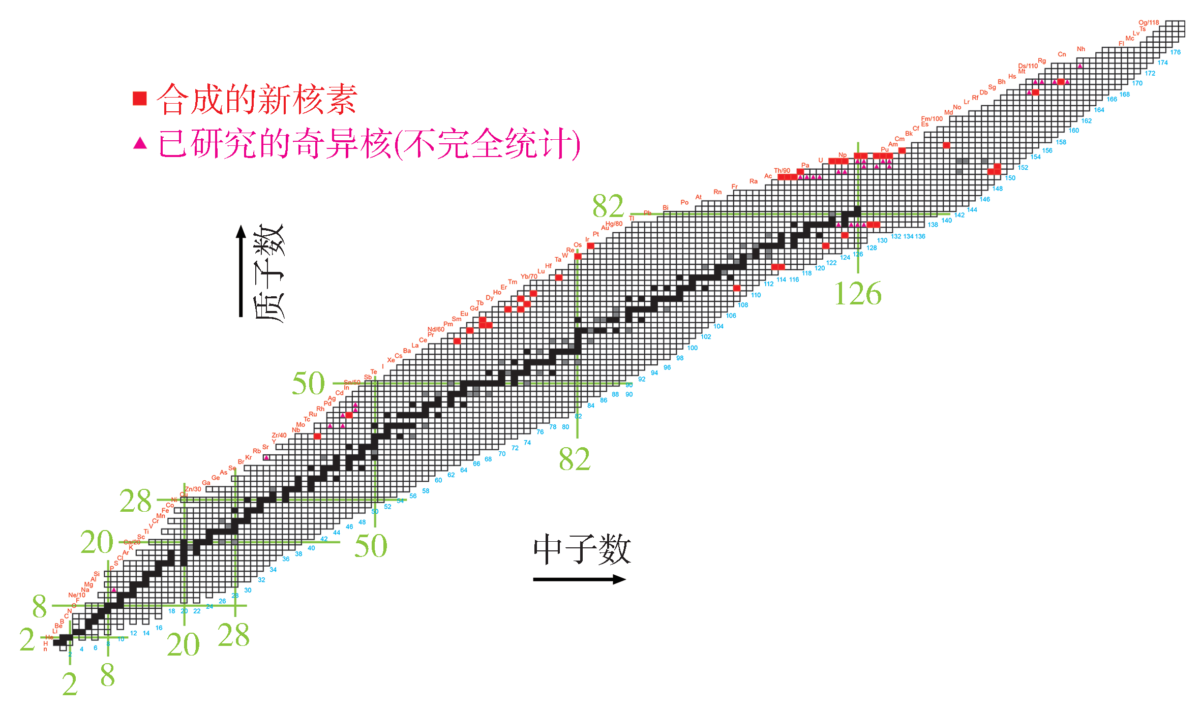 圖1 核素圖。紅色方塊是中國(guó)合成的新核素,粉紅三角形表示的是部分已研究的奇異核。黑色方塊是在自然界中存在的穩(wěn)定核或者長(zhǎng)壽命放射性核,β穩(wěn)定線位于此