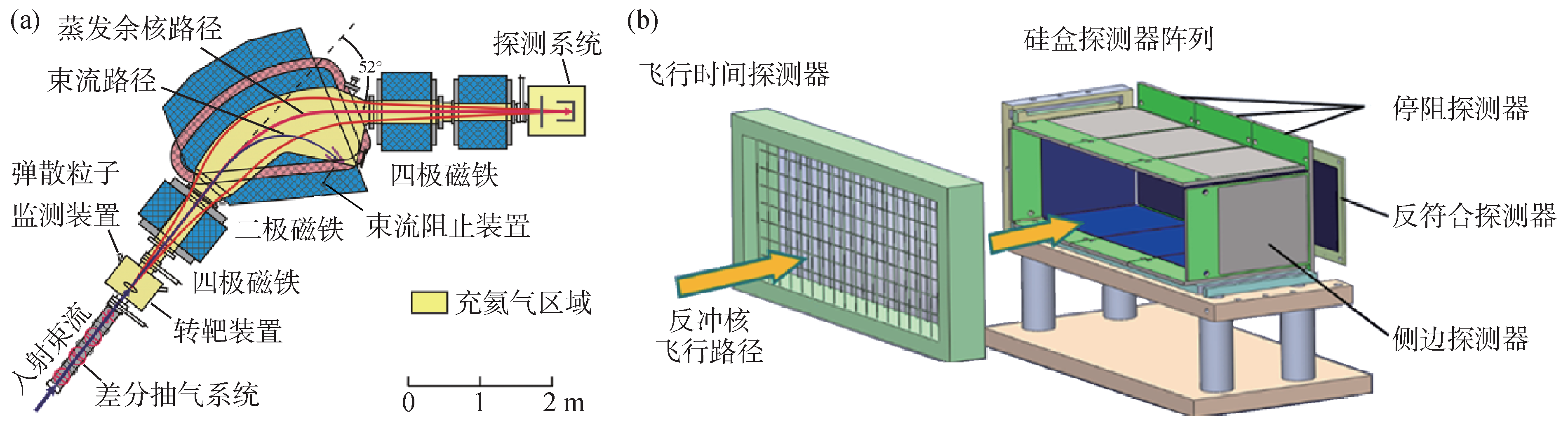 由于新核素的產(chǎn)生截面極低,產(chǎn)生的少量目標(biāo)原子核與極大量的已知核素混雜在一起,我們需要將之分離出來(lái),這需要強(qiáng)大的分離設(shè)備。目前,國(guó)際上通用的放射性束流分離方法有在線同位素分離法和在束飛行分離法。由于在線同位素分離法可以使用厚靶,其產(chǎn)額可能相對(duì)較高,但它受限于元素的化學(xué)性質(zhì),只能用于分離某些元素的同位素,且其分離時(shí)間較長(zhǎng)(幾毫秒到幾小時(shí)不等),不適于分離短壽命核素。在束飛行分離法中,產(chǎn)物在飛行中被分離,由于沒有元素化學(xué)性質(zhì)的限制,這種技術(shù)原則上可以分離大部分元素的同位素,且分離所需時(shí)間很短(短至微秒量級(jí)),可以用于短壽命核素的分離。依據(jù)設(shè)備中是否采用緩沖氣體來(lái)平衡電荷態(tài),在束分離方法發(fā)展出了磁譜儀和充氣反沖譜儀。對(duì)于彈核碎裂反應(yīng)產(chǎn)生的核素,一般采用磁譜儀分離,而充氣反沖譜儀主要用于熔合蒸發(fā)反應(yīng)產(chǎn)物的分離。衡量分離方法好壞的標(biāo)準(zhǔn)主要考慮分離的效率、分離所需的時(shí)間和本底的抑制能力。對(duì)目標(biāo)核素的分離來(lái)說(shuō),分離效率高,分離所需時(shí)間短,本底抑制能力強(qiáng)的設(shè)備就是好設(shè)備。