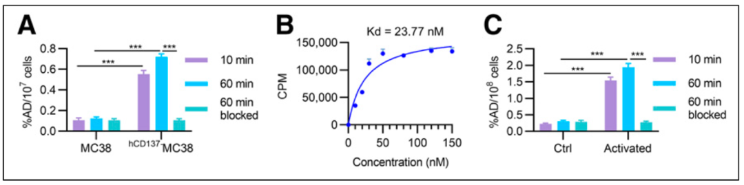 Kd值反映了該放射性示蹤劑與細胞表面CD137受體的結合強度。較低的Kd值表示示蹤劑與目標受體結合的親和力較強。