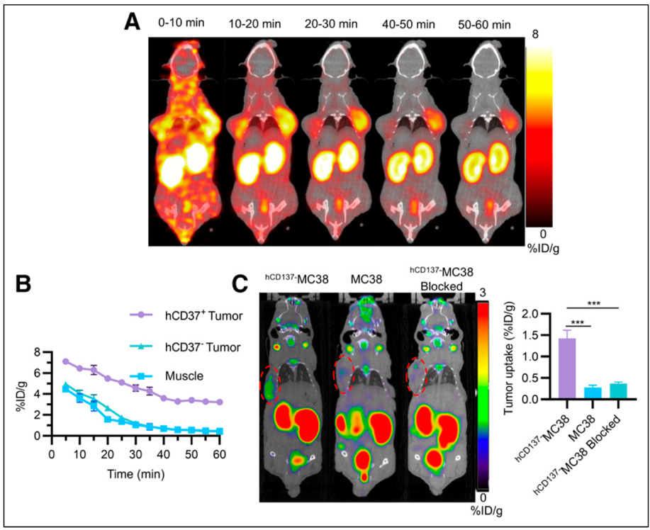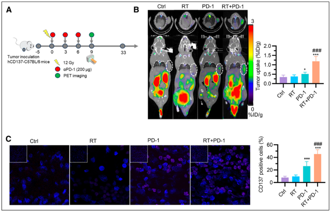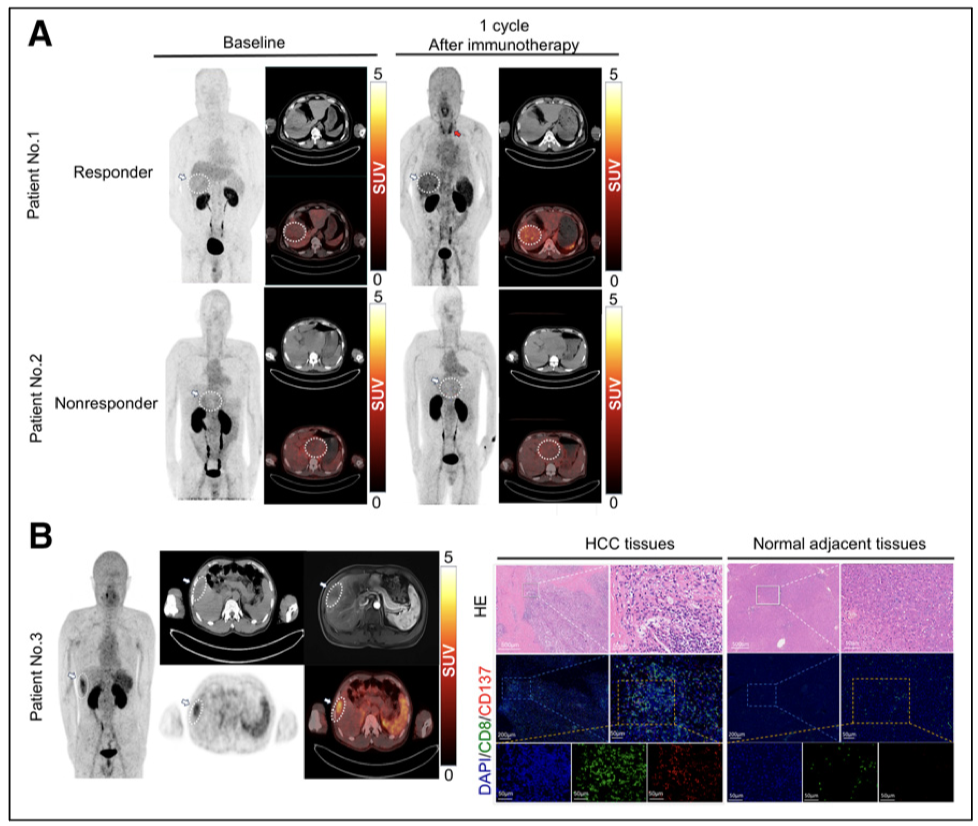 研究團隊開發了一種能夠結合CD137標記的PET顯像劑,該顯像劑能夠靶向免疫細胞的激活區域,從而提供腫瘤免疫治療過程中早期反應的影像學信息。