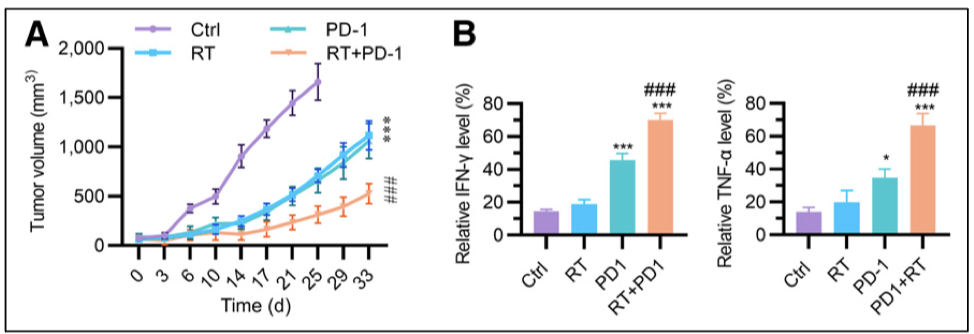 (A)展示了不同治療的荷瘤小鼠的腫瘤生長曲線。不同組別的小鼠接受了不同的治療,包括:對照組(Ctrl),放射治療組(RT),PD-1抗體治療組和放射治療+ PD-1抗體聯合治療組。