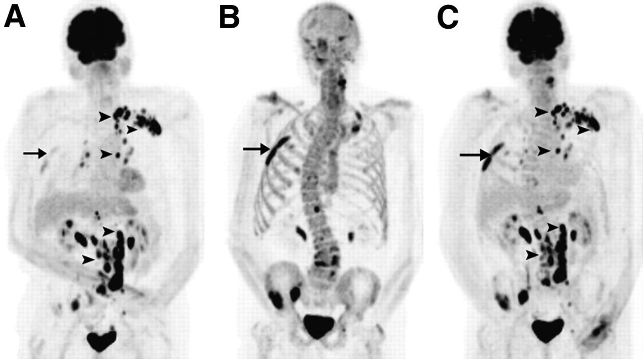 由于許多癌細胞表現出比正常細胞更高的葡萄糖代謝,以支持其快速生長和增殖,因此它們以更高的速度積累FDG。FDG攝取的差異構成了使用PET/CT掃描進行癌癥檢測和分期的基礎。PET組件顯示代謝活動增加的區域(熱點),而CT掃描提供解剖背景,允許精確定位腫瘤。