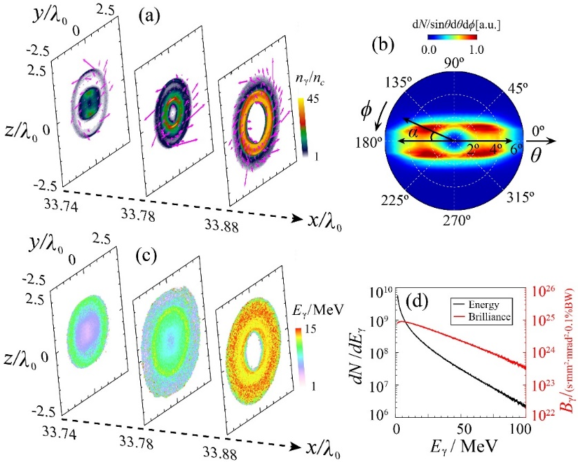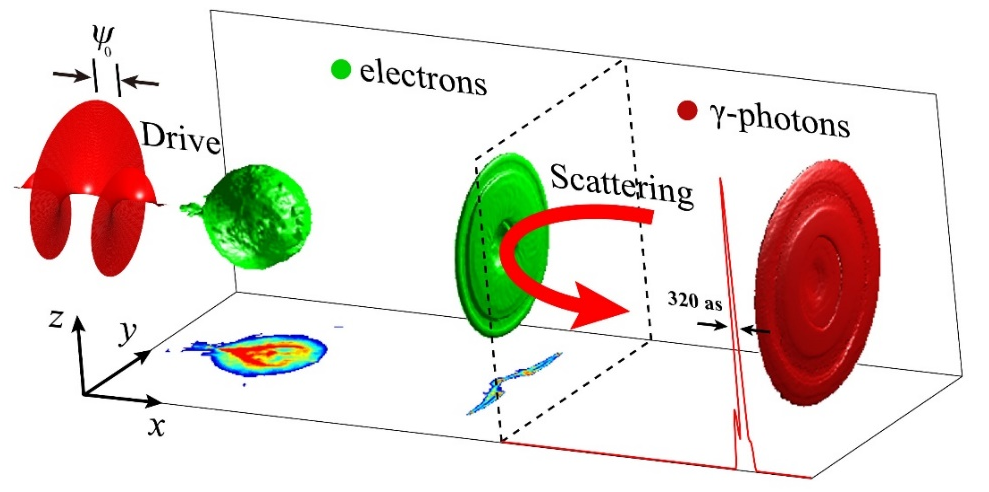 近日,國防科技大學和上海交通大學聯合團隊通過大規模三維粒子模擬提出先利用少周期渦旋激光脈沖照射微雨滴靶獲得高品質旋轉阿秒電子片,再通過另一束反向激光脈沖的非線性湯姆遜散射來產生高亮的孤立阿秒γ射線。通過構建物理模型分析了激光強度閾值和載波包絡相位如何調控孤立阿秒電子片的產生,研究了相對論旋轉電子片的非線性湯姆遜散射過程,討論了驅動激光強度對γ光子能譜、峰值亮度、角動量傳遞和能量轉化效率的影響。三維粒子模擬表明,在合適的激光條件下,該方案可以產生脈寬為320 as、峰值亮度為9.3×1024 photons/s/mrad2/mm2/0.1%BW的孤立阿秒γ射線。同時,由于旋轉電子片的角動量傳遞,γ射線攜帶2.8×1016?的角動量,導致γ光子的角分布在峰值處發生了劈裂,這有可能為實驗上研究旋轉電子片的非線性湯姆遜散射提供依據。