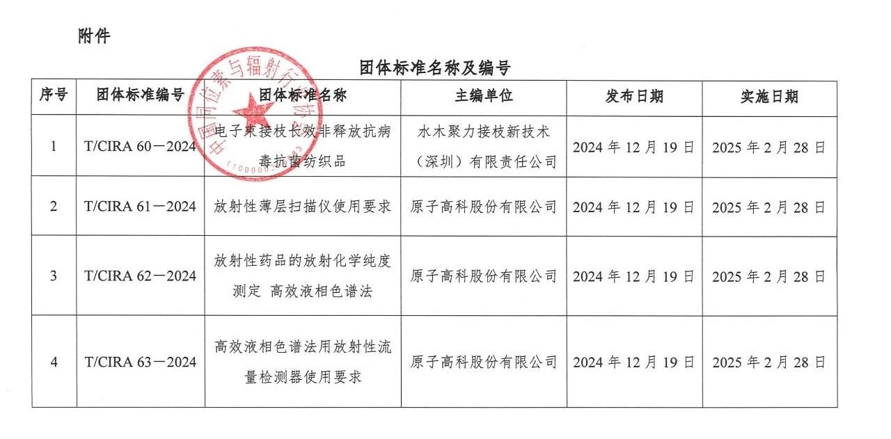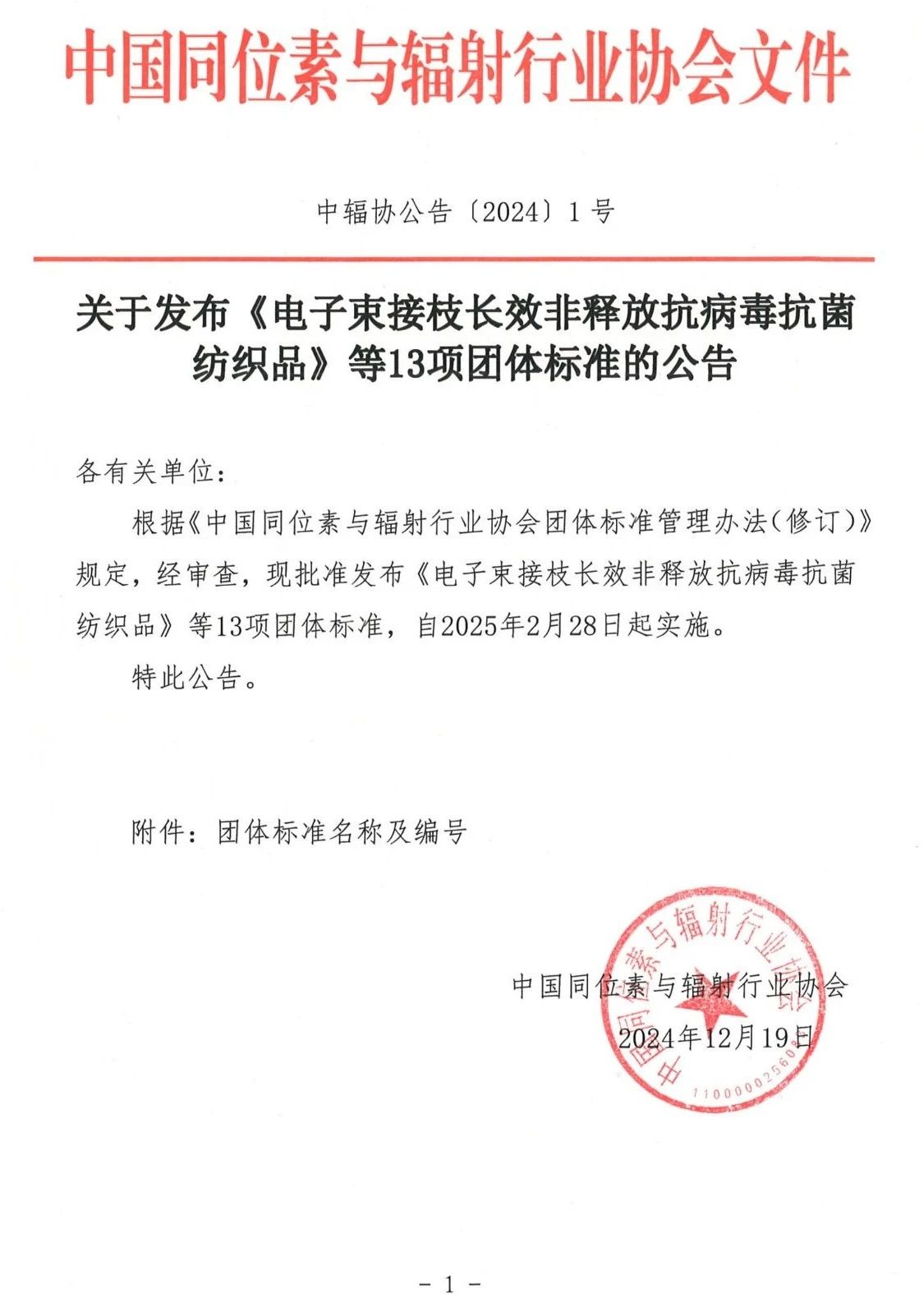 12月19日,中國同位素與輻射行業協會發布根據《中國同位素與輻射行業協會團體標準管理辦法(修訂)》規定,經審查,現批準發布《電子束接枝長效非釋放抗病毒抗菌紡織品》等13項團體標準,自2025年2月28日起實施。