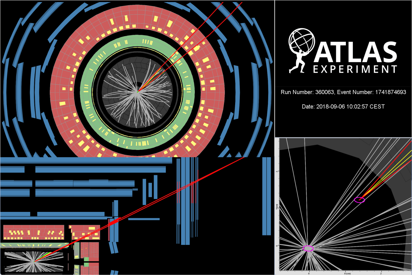顯示候選中性美介子衰變?yōu)榧ぐl(fā)中性 kaon 和 J/ψ 介子。 J/ψ 介子衰變成一對(duì) μ 介子(紅線),激發(fā)的中性 kaon 衰變?yōu)閹щ?π 介子和帶電 kaon(黃線)。 (圖片來源:ATLAS/CERN)