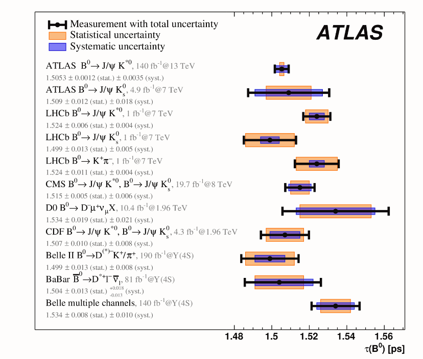 將新的 ATLAS B0 壽命結(jié)果與之前的 ATLAS 結(jié)果以及 LHCb、CMS、D0、CDF、Belle II、BaBar 和 Belle 實(shí)驗(yàn)的結(jié)果進(jìn)行比較。(圖片:ATLAS/CERN)