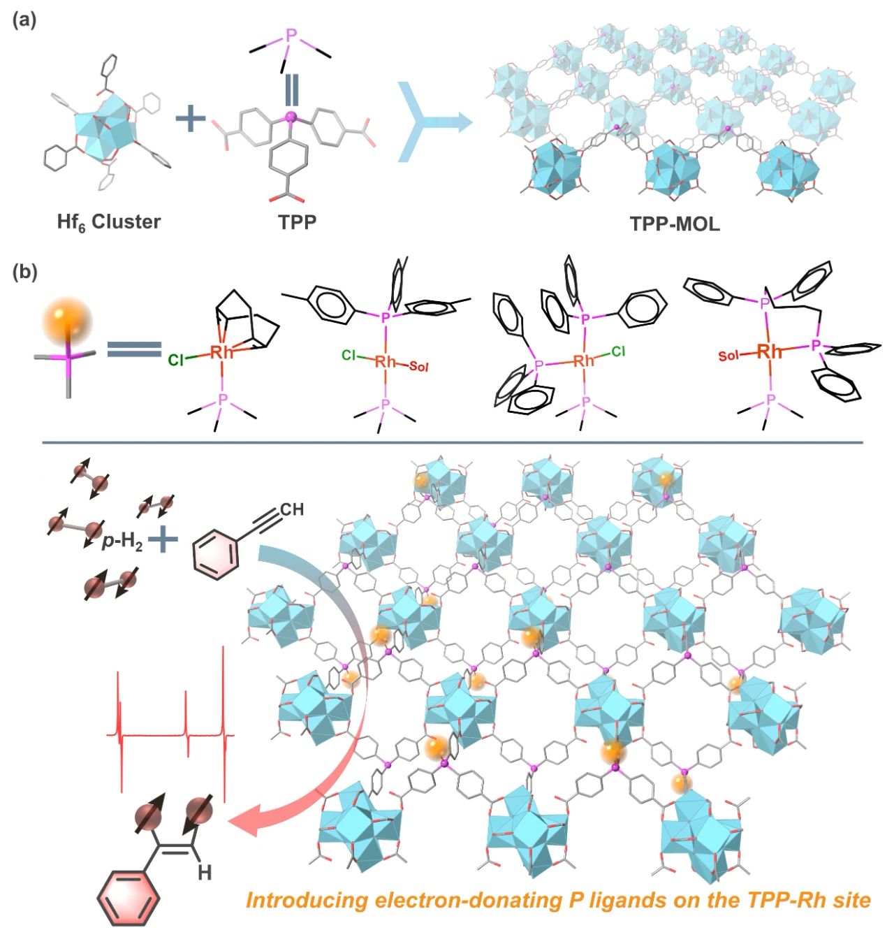 (a) 二維TPP-MOL結構,(b) 不同電子結構和配位數的膦配體與加氫活性中心Rh配位,并將它們負載于MOLs上用于PHIP。