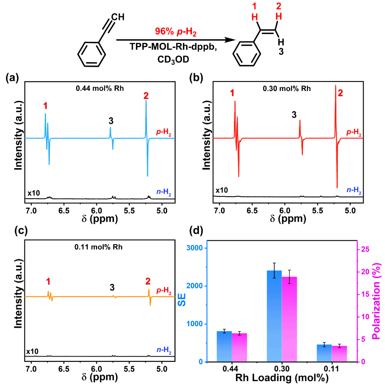在強磁場內(11. 7 T)原位加氫得到的超極化及熱平衡核磁譜。TPP-MOL-Rh-dppb中Rh負載量分別為(a) 0.44 mol% (b) 0.30 mol% (c) 0.11 mol%;(d)不同Rh負載量下超極化信號的增強倍數和氫核自旋的極化值。