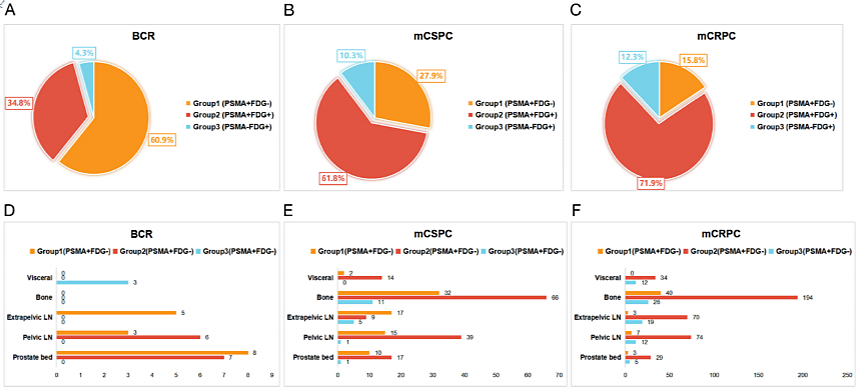 采用雙示蹤劑PET/CT對不同階段前列腺癌的異質表型進行分析。A-C,不同異質表型的比例。D-F,不同異質表型的病變分布。