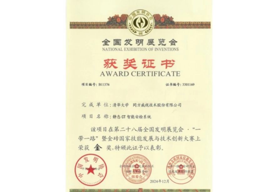 12月11日至13日,第二十八屆全國發明展覽會·“一帶一路”暨金磚國家技能發展與技術創新大賽在廣東省中山市舉辦。經網上評審和現場評審,清華大學與同方威視共同申報的“靜態CT智能安檢系統”項目在此次全國發明展覽會評選中脫穎而出,榮獲全國發明展覽會金獎。