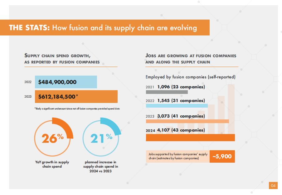 根據聚變公司報告的數據,行業員工數量從2021年23家公司的近1,100人增加到了2024年43家公司的4,100多人(該數據可能顯著低估,因為并非所有核聚變公司都提供了數據)。供應鏈支出也有大幅增長,從2022年的4.85億美元增長到2023年的6.12億美元,預計2024年還將增長21%。聚變公司預計,目前供應鏈支持的就業崗位約為5,900個,隨著技術的進步該數字將進一步增長。