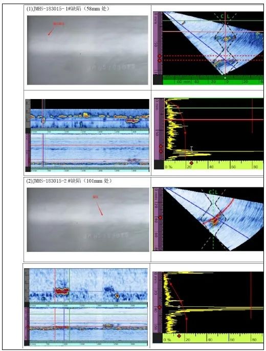 相控陣檢測工藝采用B 級技術(shù)等級,單面雙側(cè)扇形掃查,公稱厚度小于30mm采用一次波和二次波同時設(shè)置檢測;公稱厚度大于30mm采用一次波和二次波分開設(shè)置檢測。具體見工藝規(guī)程。缺陷定量采用定量線絕對靈敏度法按影像的實(shí)際輪廓測定缺陷指示長度,缺陷的高度采用相控陣成像技術(shù)。大厚壁試驗(yàn)對比采用JMHS-183015 大厚壁試塊,規(guī)格:400×400×43mm,材質(zhì):20#,對比檢測數(shù)據(jù)如下: