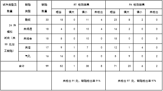 通過對24 件大、中、小徑模擬試塊共99 處加工缺陷進(jìn)行了射線檢測和相控陣超聲檢測比對試驗(yàn),其中裂紋33 處、未焊透18處、未熔合15、夾渣17 處、氣孔16處。RT 共檢出91 處缺陷,缺陷檢出率為91%,其中4 處裂紋、4處未焊透缺陷未能清晰地檢出,主要為厚壁試件;另外91處缺陷檢出結(jié)果1 處偏大外,38處偏小,其余與設(shè)計(jì)尺寸基本相當(dāng)。PA共檢出97處缺陷,缺陷檢出率為97%,針對2 處橫向裂紋,因焊縫存在余高,故對2 處橫向裂紋進(jìn)行測長比較困難;針對2處氣孔檢測困難未檢出,71處缺陷檢出的結(jié)果尺寸相當(dāng)、20處偏大。