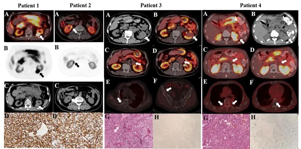 病例展示:四名腎腫瘤患者接受了碳酸酐酶IX靶向 PET/CT 成像,無創成像結果與病理結果吻合度高