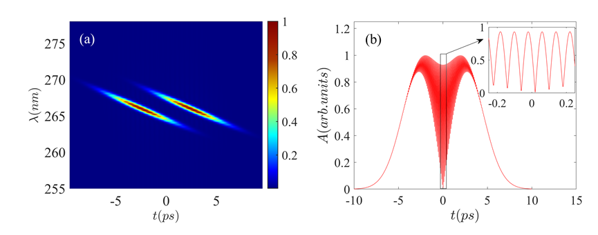 啁啾拍頻激光系統主要包括一對平行光柵(G1,G2)、一個分束鏡(Beam splitter, BS)、一個光學延遲線、一個合束鏡(Beam combiner, BC)等,如圖1(b)所示。超快激光脈沖(約100 fs)首先通過平行光柵來引入線性啁啾和時間展寬。然后啁啾激光脈沖(約ps)通過反射器引入右上方的藍色線,并由分光鏡分成完全相同的兩束。其中一束通過光學延遲線引入一個可調的時間延遲,使這兩束相同的激光束在合束鏡處拍頻,形成如圖2所示的啁啾拍頻激光(Laser2)。